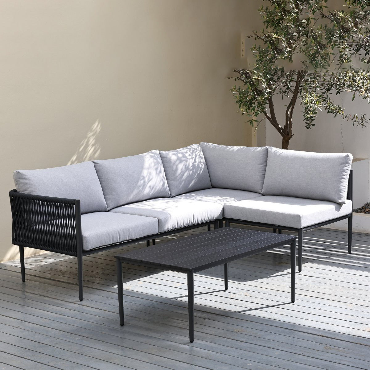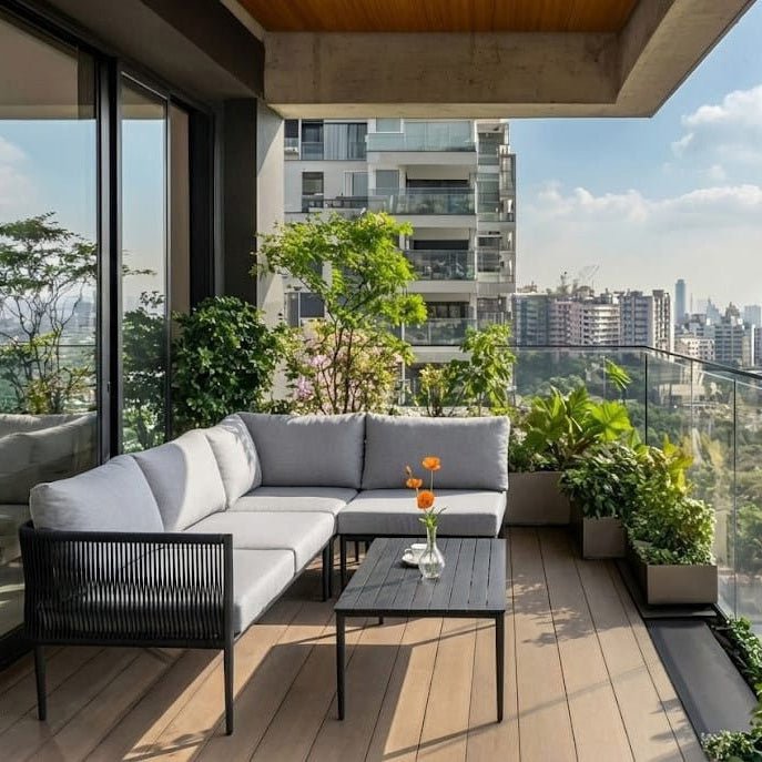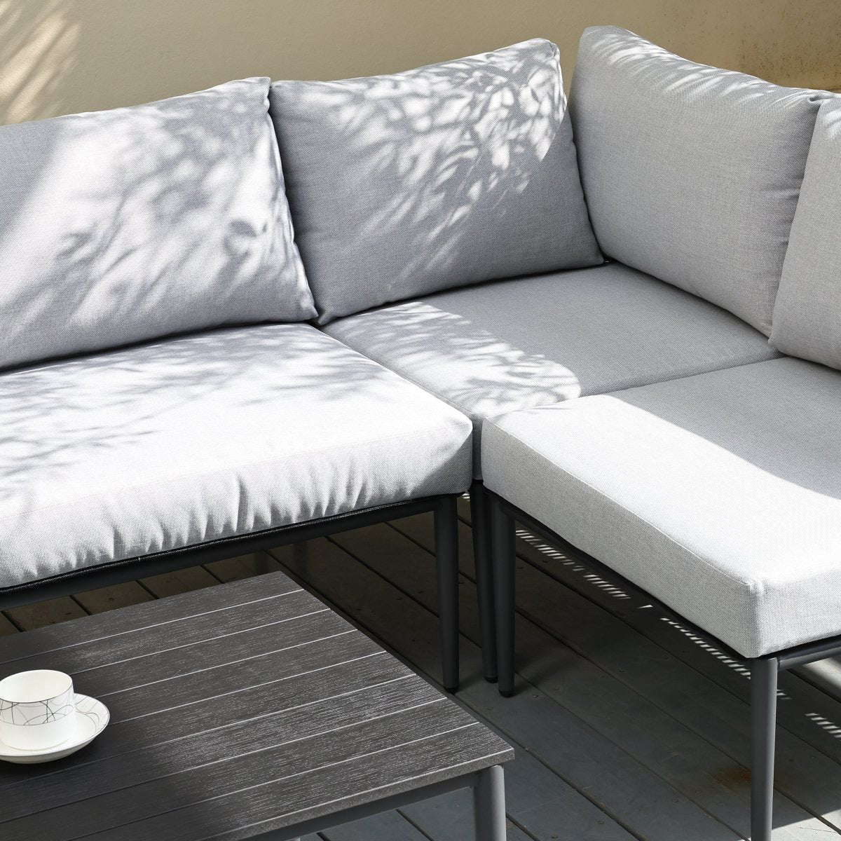 El Seccional Cantaria Derecho optimiza tu terraza con una estética contemporánea que mezcla texturas premium. Su disposición en "L" con el chaise longue al lado derecho (mirando el mueble de frente) es ideal para delimitar espacios y crear un rincón acogedor.
