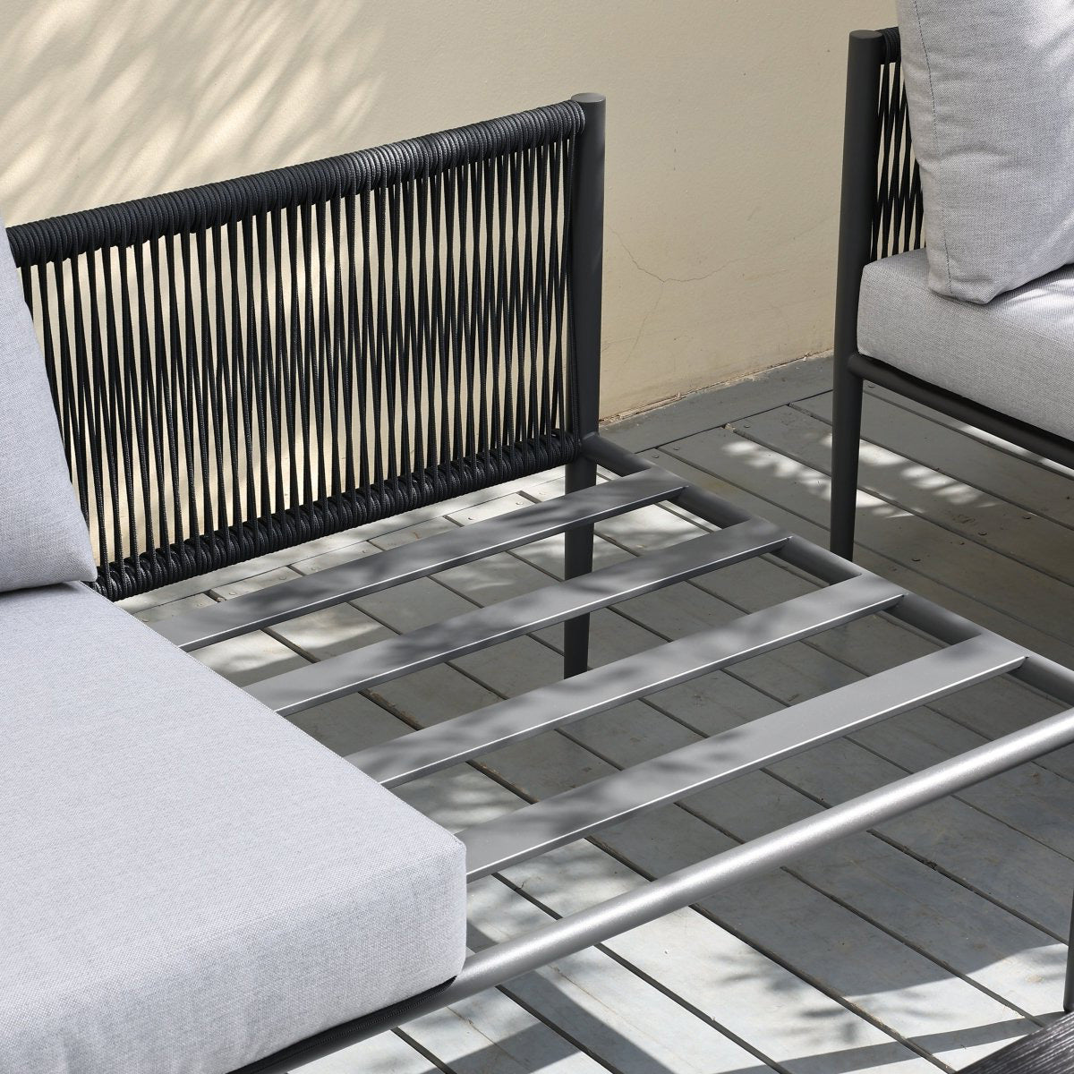 Fabricado con aluminio reforzado, es inmune al óxido y muy liviano. Se complementa con una mesa de centro con cubierta de WPC (Madera Plástica), que ofrece la belleza de la madera pero resiste manchas, líquidos y sol sin necesidad de mantención.
