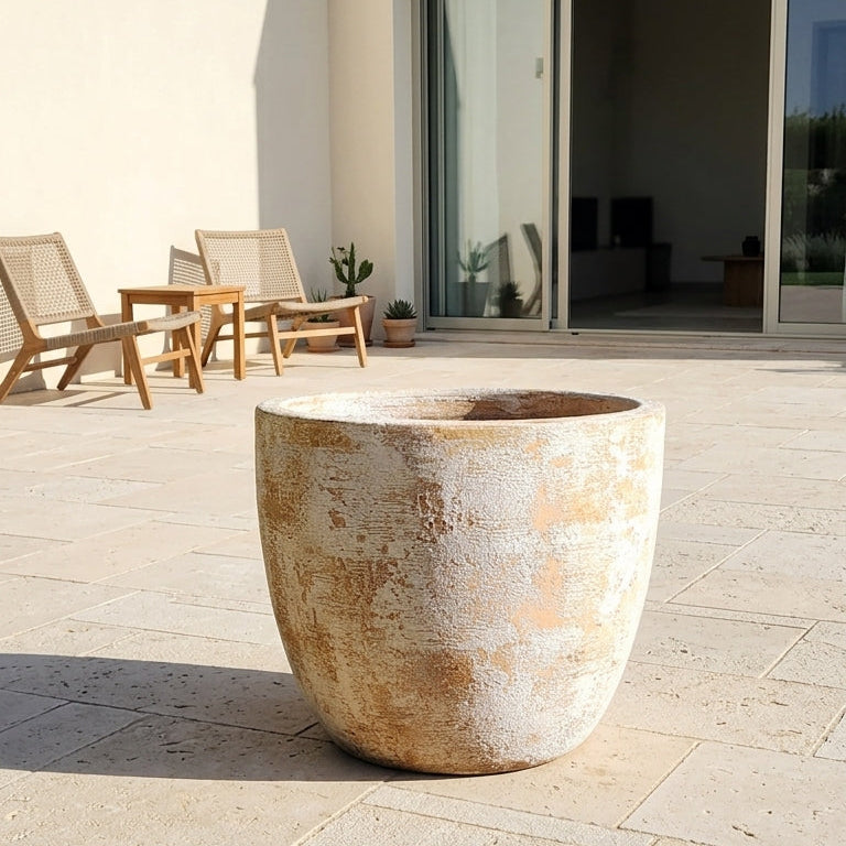 Su acabado envejecido aporta textura, profundidad y un carácter más orgánico, ideal para ambientes que buscan una estética sobria y atemporal. Es un macetero de gran presencia visual, pensado para proyectos que valoran materialidad, volumen y un lenguaje más natural.