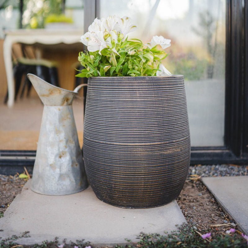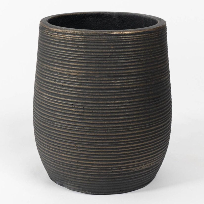 El modelo Amancay Dorado está decorado con anillos horizontales estrechamente espaciados, con acabado color negro y tonalidades doradas, esta maceta elegante y sofisticada resaltará cualquier espacio, tanto interiores como exteriores
