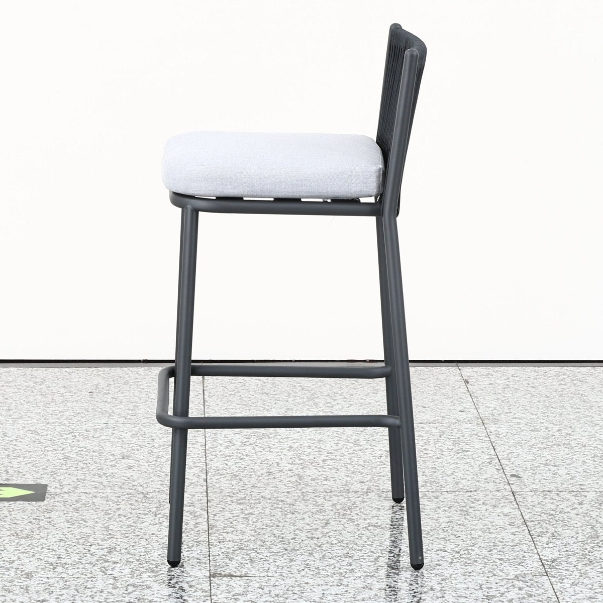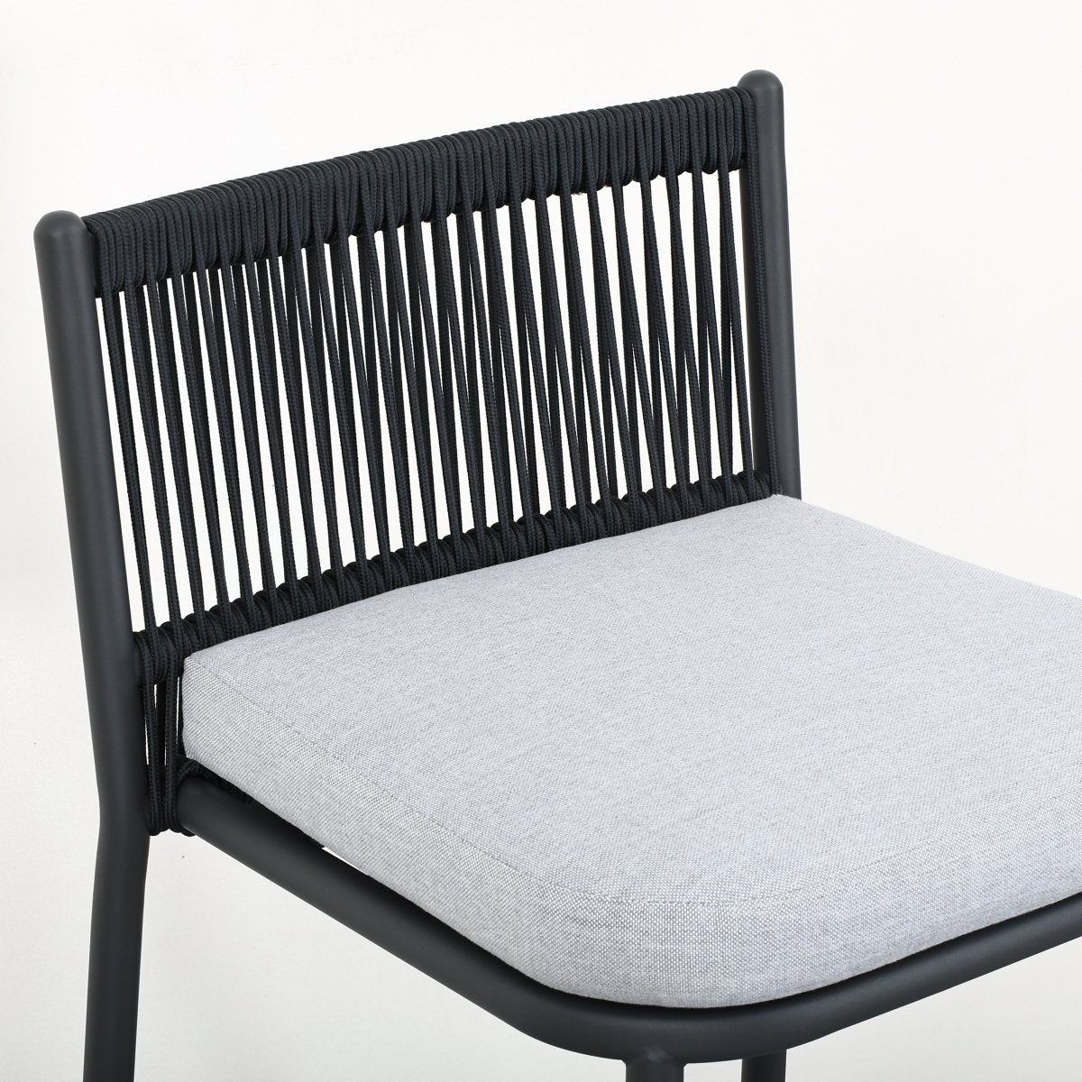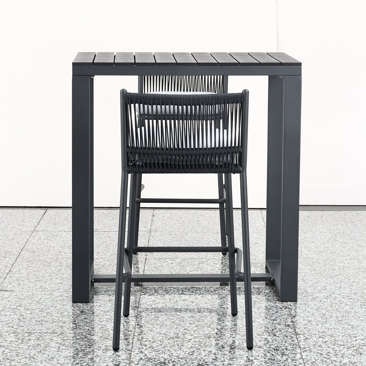 Set compuesto por una mesa de bar y dos sillas altas con estructura de aluminio y cuerda náutica resistente al exterior.