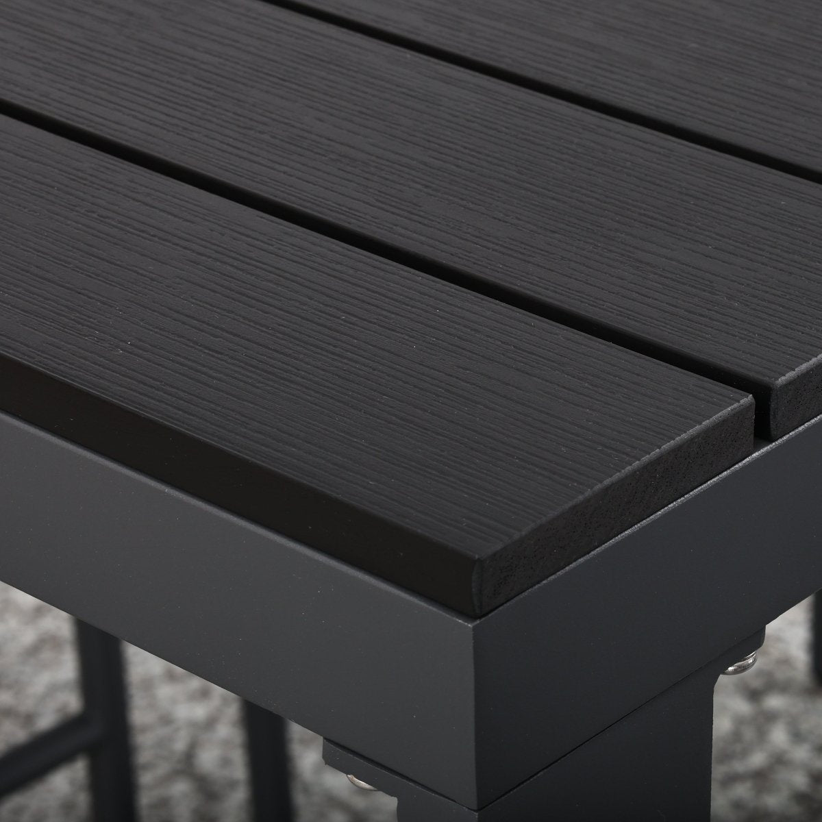 La mesa incluye cubierta de WPC y los cojines cuentan con fundas removibles para fácil limpieza.