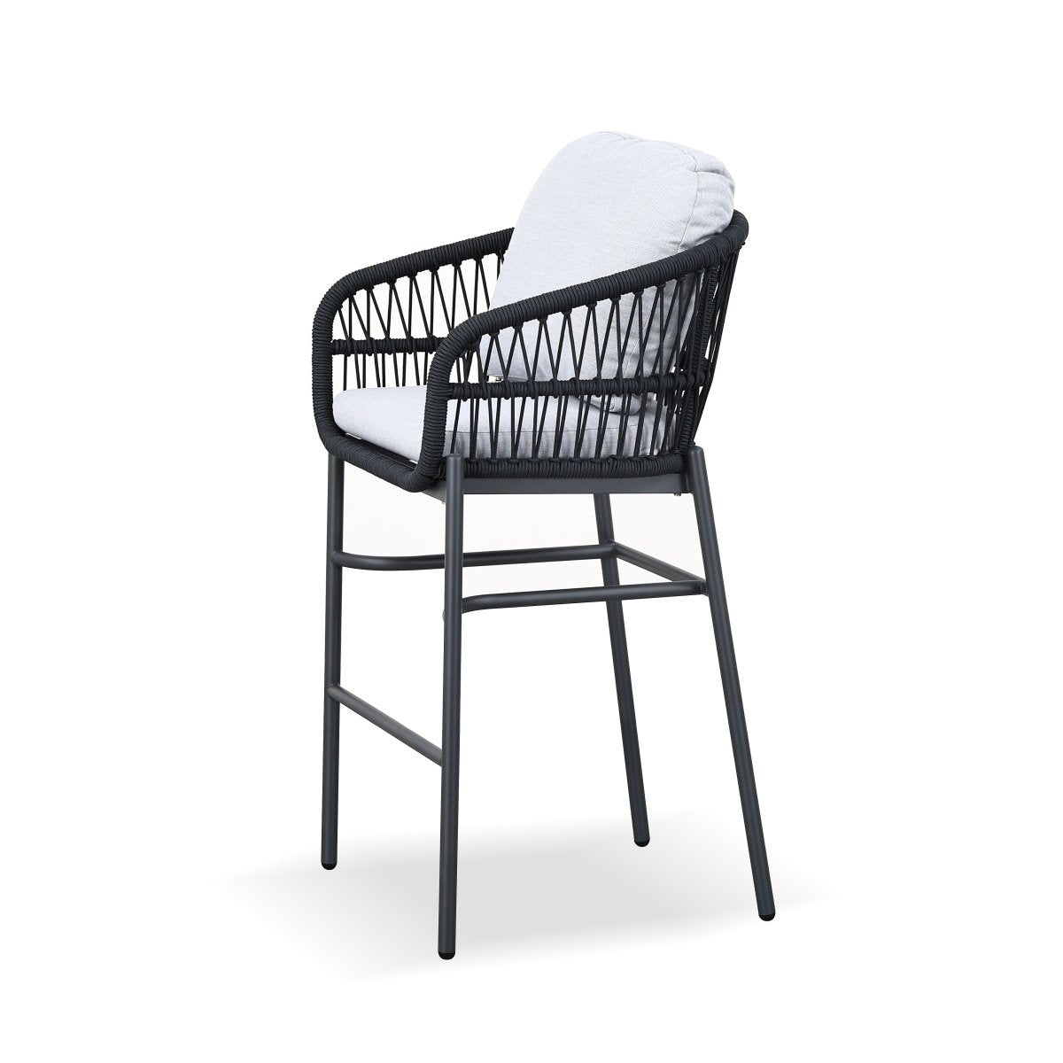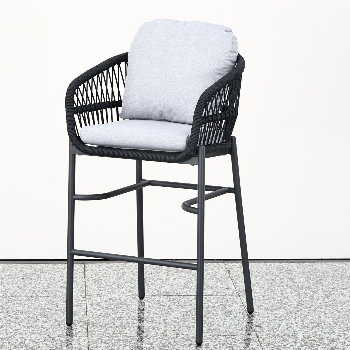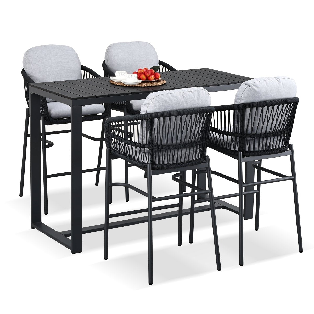 Eleva el nivel de tu terraza: diseño "High Dining" con sillas altas tejidas en cuerda náutica, mesa de bar con cubierta de WPC (simil madera) de alta resistencia y cojines lavables. ¿Buscas protección total? Pregunta por nuestra funda impermeable compatible (venta por separado).