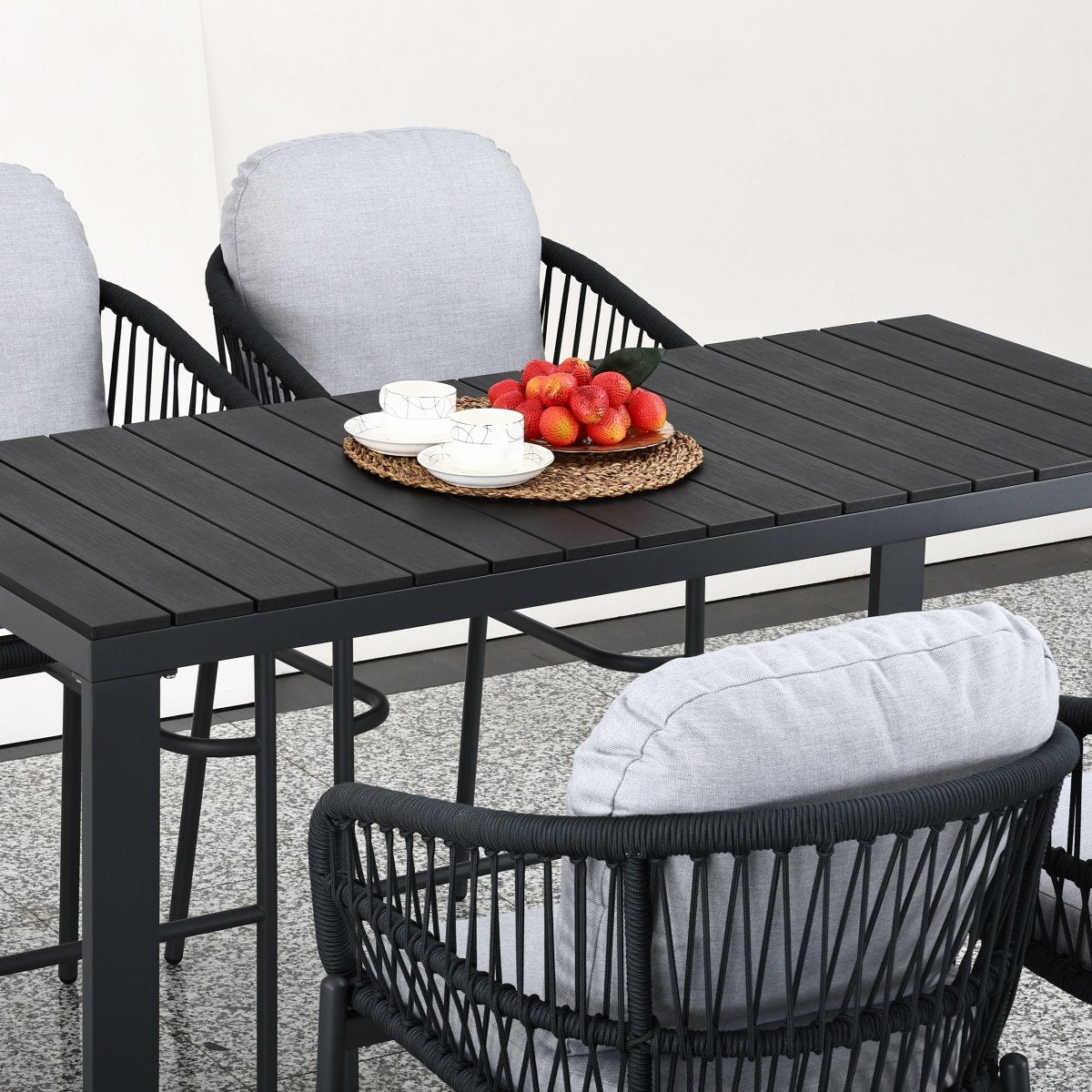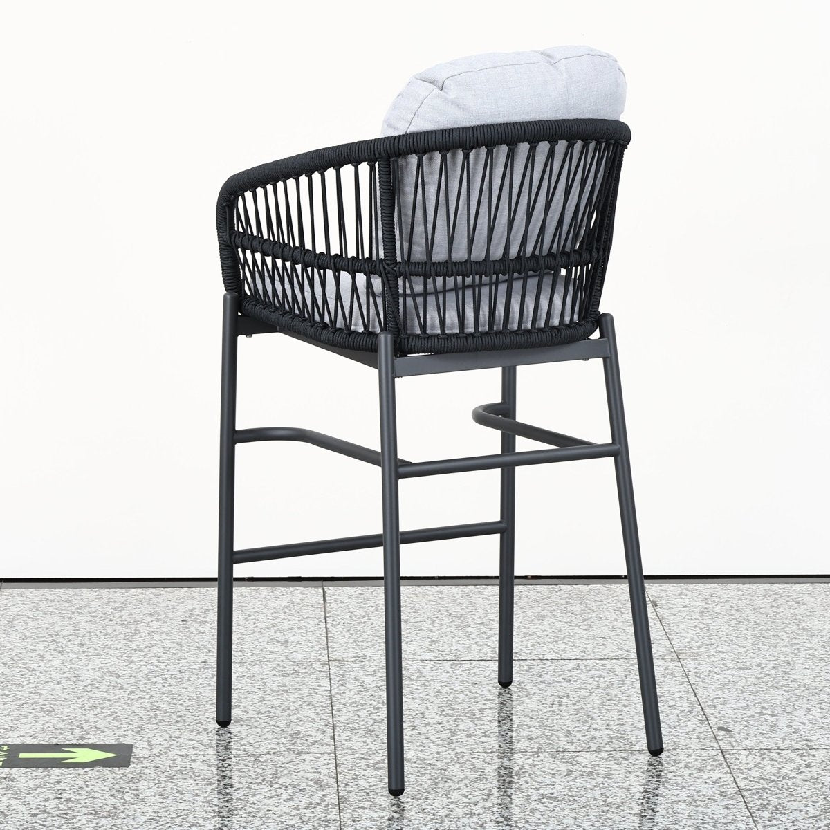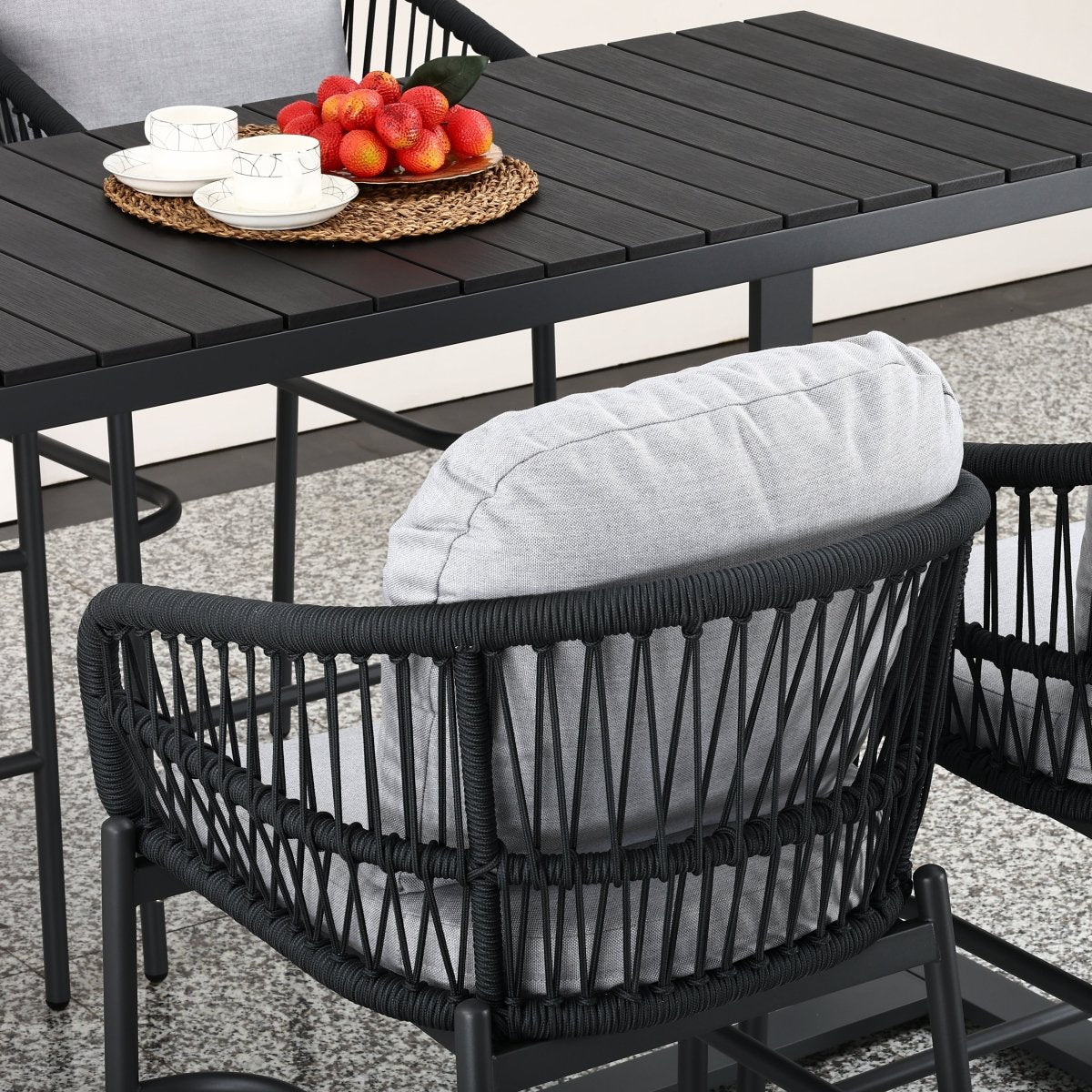 Eleva el nivel de tu terraza: diseño "High Dining" con sillas altas tejidas en cuerda náutica, mesa de bar con cubierta de WPC (simil madera) de alta resistencia y cojines lavables. ¿Buscas protección total? Pregunta por nuestra funda impermeable compatible (venta por separado).