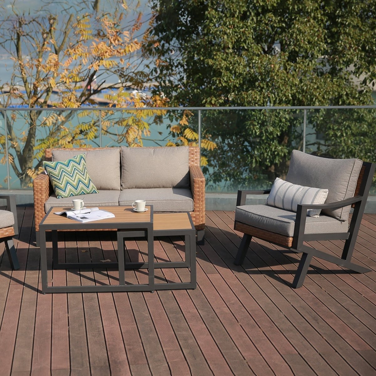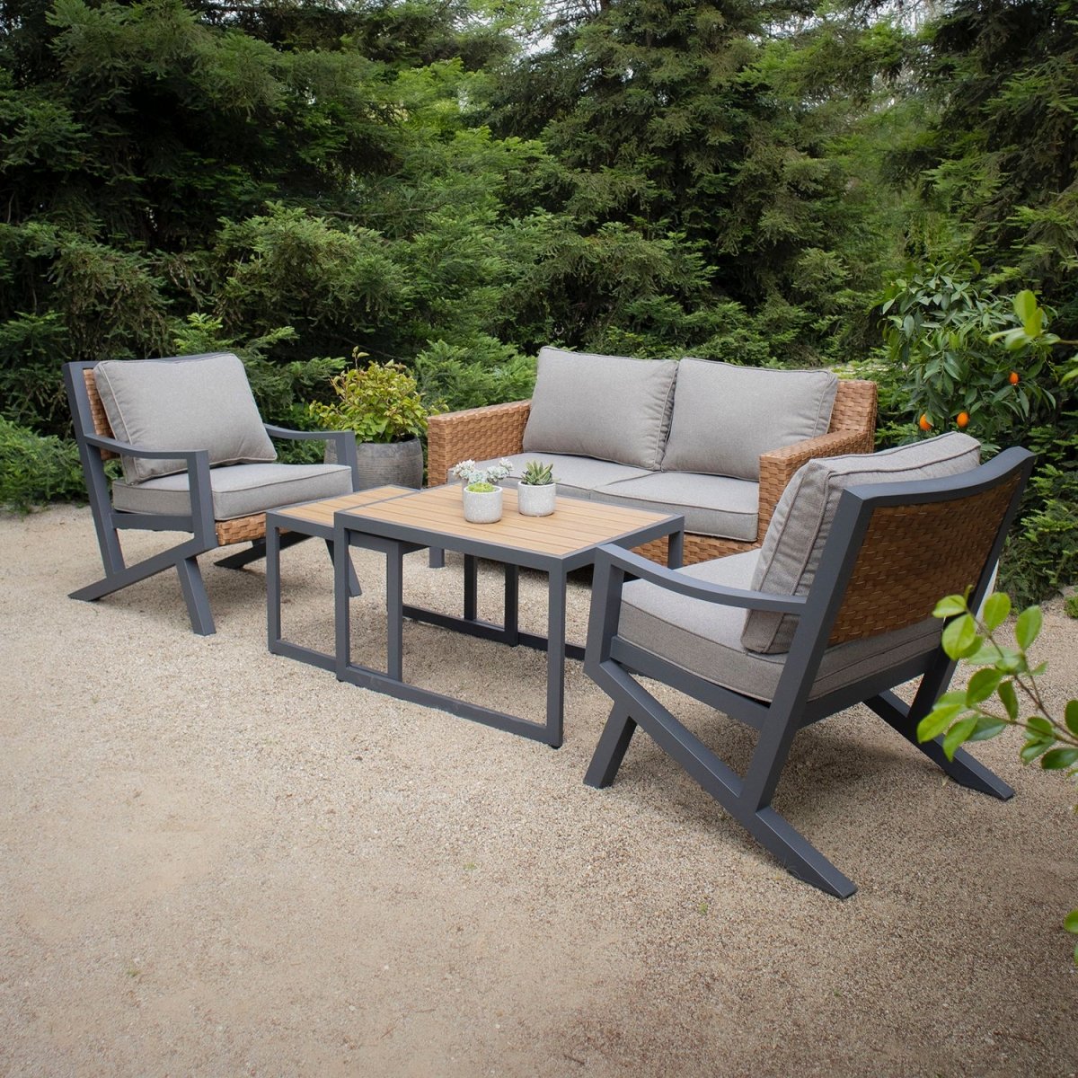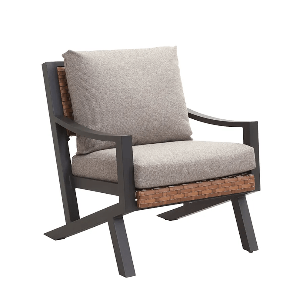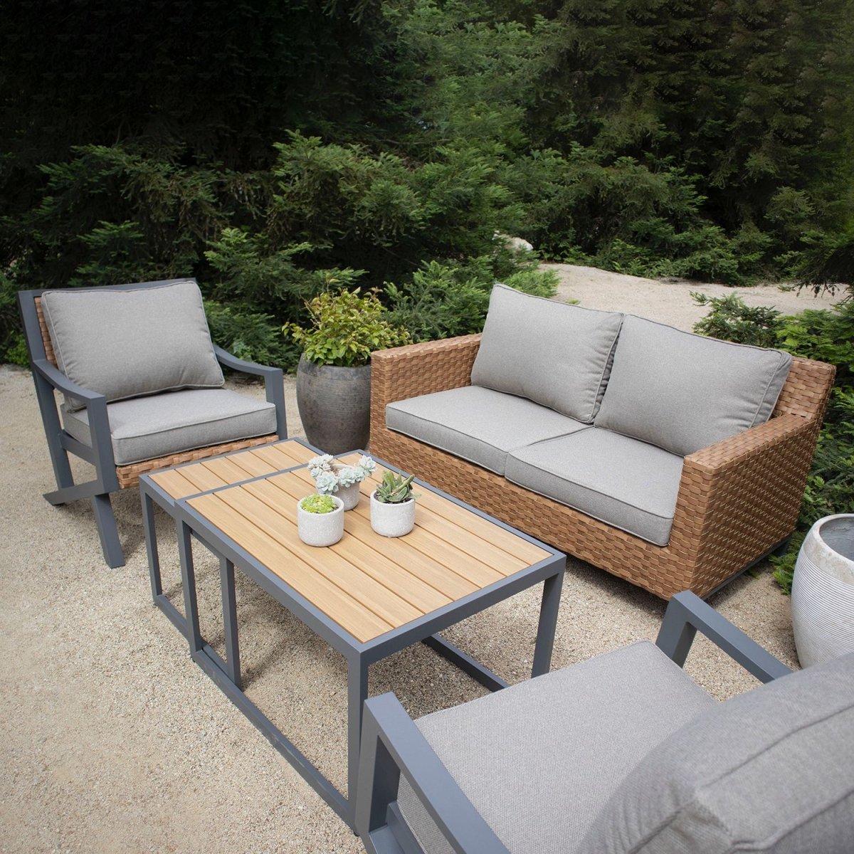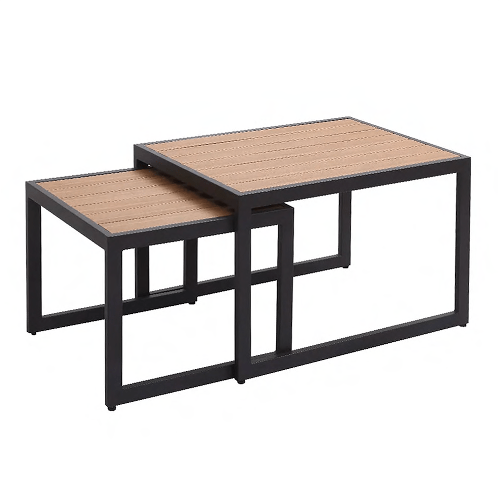 Fabricado con estructura de aluminio, tejido de ratán sintético que aporta calidez al conjunto, las mesas de centro cuentan con una superficie de polywood y cojines tapizados con tela outdoor resistentes, hidrorrepelentes, rellenos de espuma y fundas removibles para lavar.