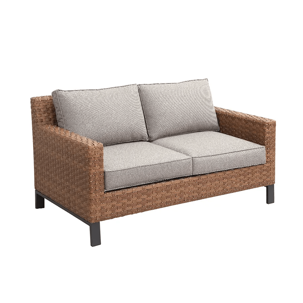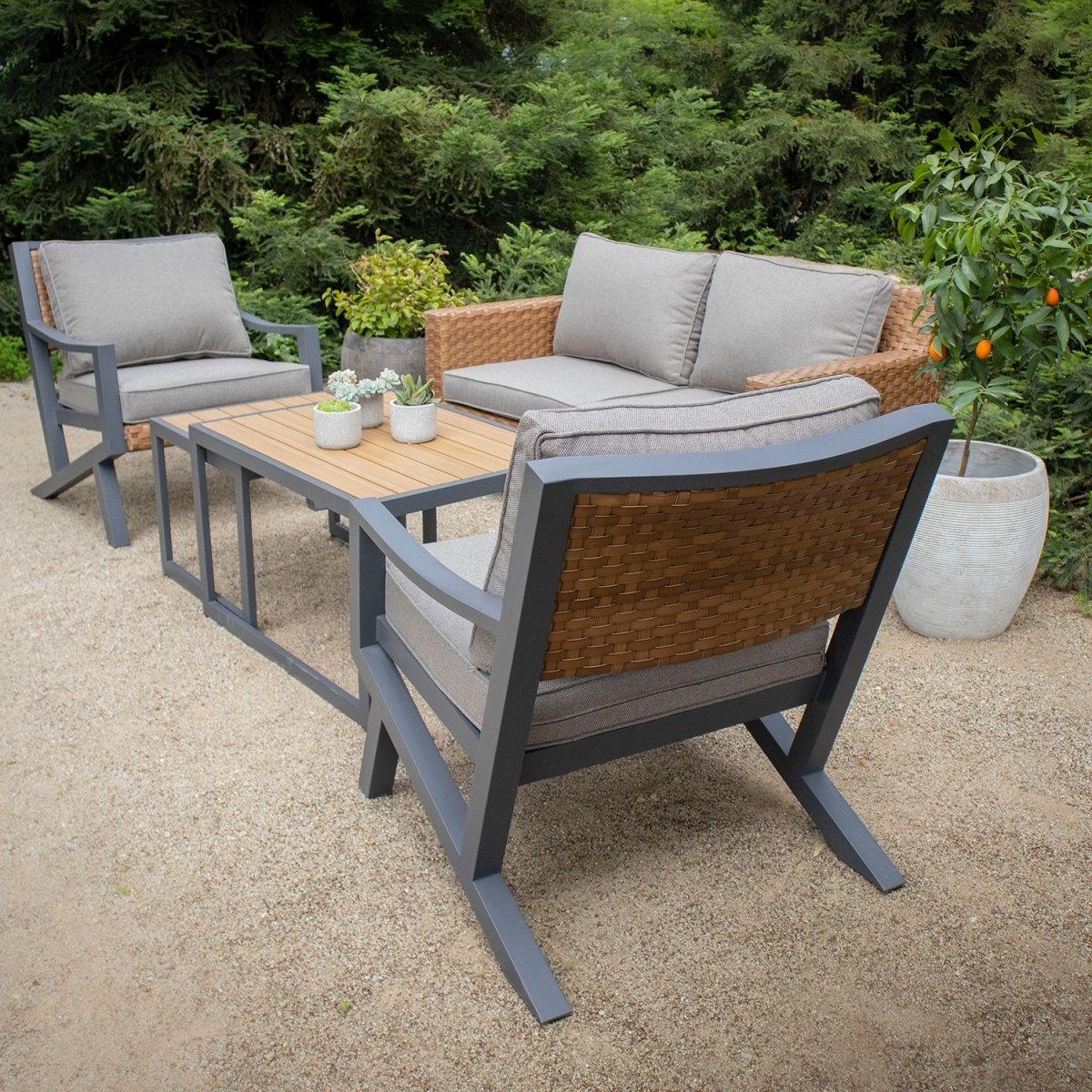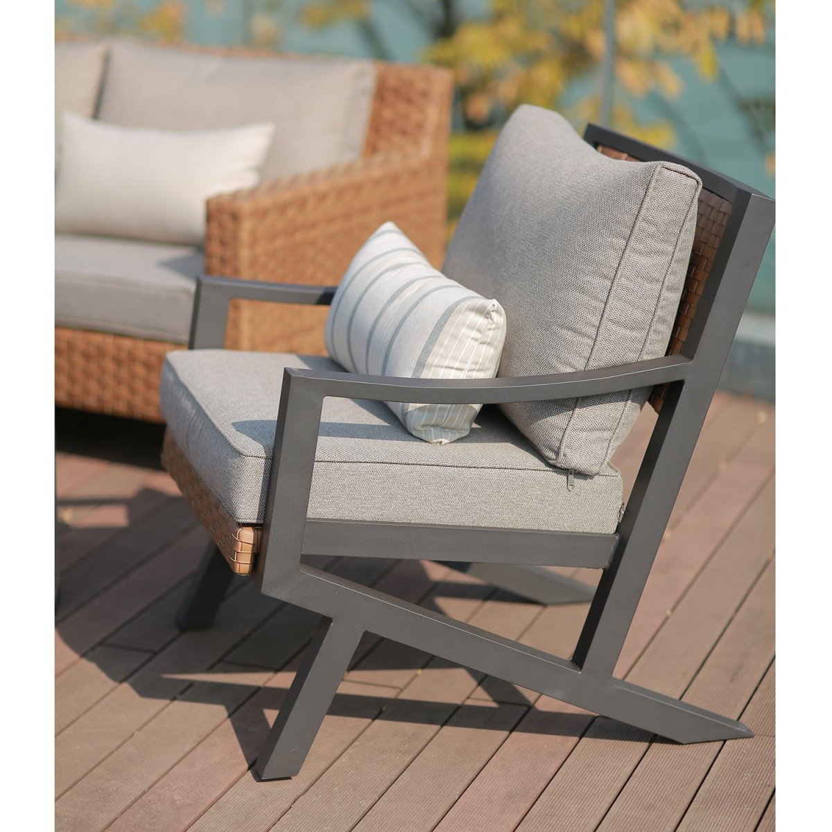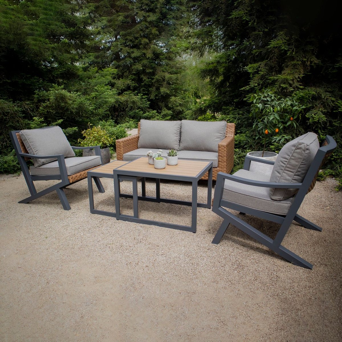 Fabricado con estructura de aluminio, tejido de ratán sintético que aporta calidez al conjunto, las mesas de centro cuentan con una superficie de polywood y cojines tapizados con tela outdoor resistentes, hidrorrepelentes, rellenos de espuma y fundas removibles para lavar.