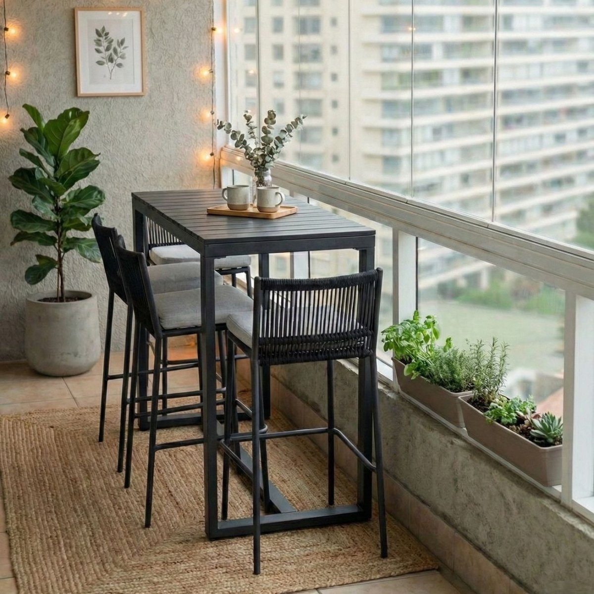 Perfecto para disfrutar desayunos, cenas o momentos de conversación al aire libre, el Juego de Bar Tagua 4P combina diseño, funcionalidad y materiales de alta calidad para realzar cualquier terraza o balcón.