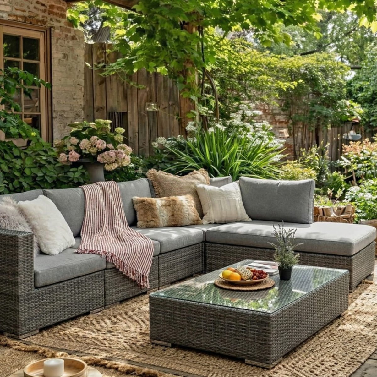 Aunque parece fibra natural, está fabricado con una estructura interna de aluminio 100% inoxidable revestida en ratán sintético de alta gama. Incluye una mesa de centro con cubierta de vidrio templado para fácil limpieza y una mesa lateral auxiliar completamente tejida (sin vidrio), perfecta para apoyar libros o accesorios.